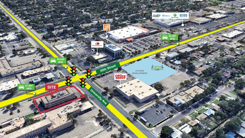 Twenty Four Office Plaza is a value-add office building for sale, positioned at the lighted intersection of 50th Street and University Avenue—one of Lubbock’s busiest corners with over 40,000 vehicles passing daily. This three-story property offers excellent visibility, multiple access points, and ample parking. The site presents a strong opportunity for repositioning or redevelopment, with potential for a QSR or convenience store user.