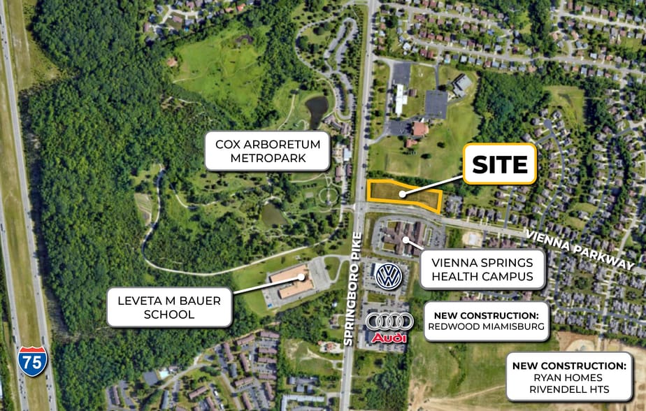 Frontage on Springboro Pike (SR-741) with over 25,000 vehicles per day Less than a mile from I-75 with over 92,200 vehicles per day Across the street from the Cox Arboretum MetroPark and Vienna Springs Health Campus Just north of the retail-heavy Dayton Mall .5 miles to the intersection of SR741 and SR725 Significant new residential development nearby. Perfect for medical office or neighborhood uses Signalized Interchange