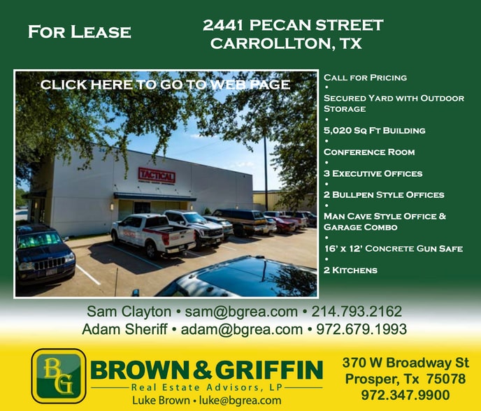 The property at 2441 Pecan Street in Carrollton, Texas, consists of a 5,020-square-foot office/flex building with a secured yard. The interior includes multiple private offices, open work areas, a conference room, and two kitchens. The site is located near major transportation routes, including the Dallas North Tollway, President George Bush Turnpike, and Sam Rayburn Tollway, providing regional connectivity. Call for lease and sale price info.