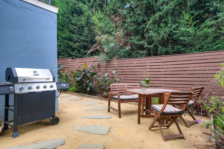 Key features include four covered parking spaces, a shared laundry room, and a low-maintenance backyard with garden and seating area—amenities that support tenant retention and long-term value. Three units will be delivered vacant.