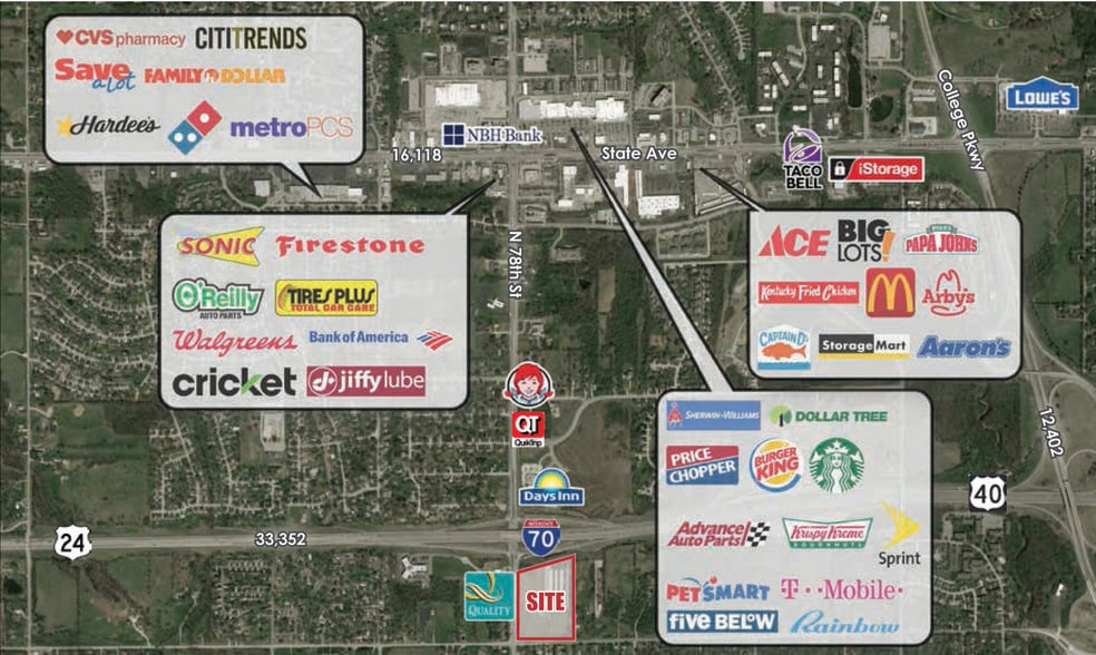 Regional demand generators include Kansas Speedway, Cabela’s, Great Wolf Lodge, Nebraska Furniture Mart, KC Monarchs Baseball Stadium, Children’s Mercy Hospital Soccer Stadium, Homefield Youth Sports. Facility, Margaritaville Resort, and Hollywoo Casino. Explosive growth and new delopments (announced and under construction) include Buc-ee’s, American Royal Complex, Mattel Adventure Park, and more! Minutes from Legends Outlets exclusive designer shopping center with over 10 million shoppers per year. Minutes from the new proposed Chiefs Stadium. One of the last remaining I-70 exit sites available.