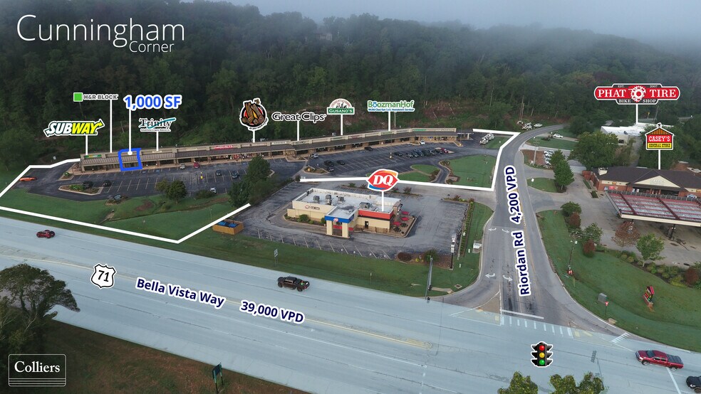 Rare opportunity to lease desirable retail or office space at Cunningham Corner in Bella Vista, Arkansas. Highly visible shopping center in the heart of the city surrounded by residential neighborhoods and near Kingswood Golf Course and Country Club, the Back 40 trailhead. Bella Vista Way (Highway 71) boasts more than 39,000 cars per day and is a main connector between Missouri commuters into the Northwest Arkansas market. Future plans nearby include an extension to the Razorback Greenway from Mercy Way to trailheads surrounding Cunningham Corner.