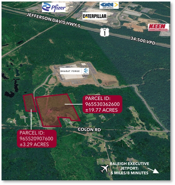 ±23.06 acres of industrial land available for lease in Sanford, NC, offering flexible development potential across two contiguous tracts. Ownership will consider build-to-suit (BTS) options, including IOS laydown yard with tech flex or flex/industrial configurations supported by conceptual site plans. The property is strategically located at Colon Road and Tabitha Lane in Lee County, with convenient access to Jefferson Davis Highway (US-1), a major north-south corridor. The site benefits from strong regional connectivity and visibility, with traffic counts of approximately 34,500 VPD on US-1 and 4,100 VPD on Colon Road.