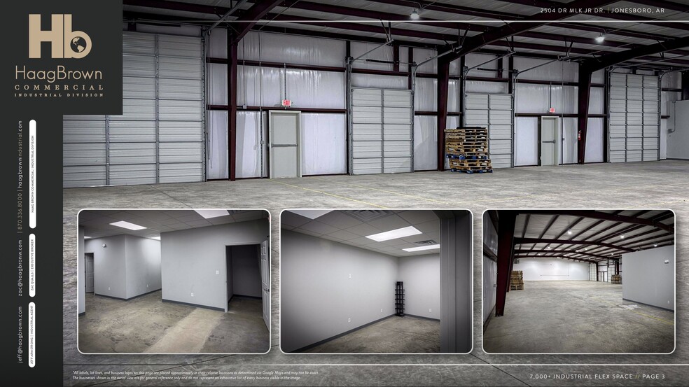 Located at 2504 Suite G MLK Jr Drive, this 7,000 SF flex space offers a versatile solution for businesses requiring a mix of warehouse, office, and counter sales area. Situated within the heart of Jonesboro's industrial sector, the property neighbors major regional employers such as Post Foods, Hytrol, and Anchor Packaging. The facility is designed to support light industrial operations, providing a functional environment for companies looking to establish or expand their presence in a high demand business corridor. The site is positioned along MLK Jr. Drive between Highway 18 and the I-555 bypass, offering immediate regional connectivity. Located less than a mile from I-555 interchange, the property ensures efficient transit throughout Northeast Arkansas and beyond. This accessibility, combined with its location among established industrial leaders make this leasing opportunity an ideal hub for service based businesses, distributors, or light manufacturers seeking reliable logistics advantage.