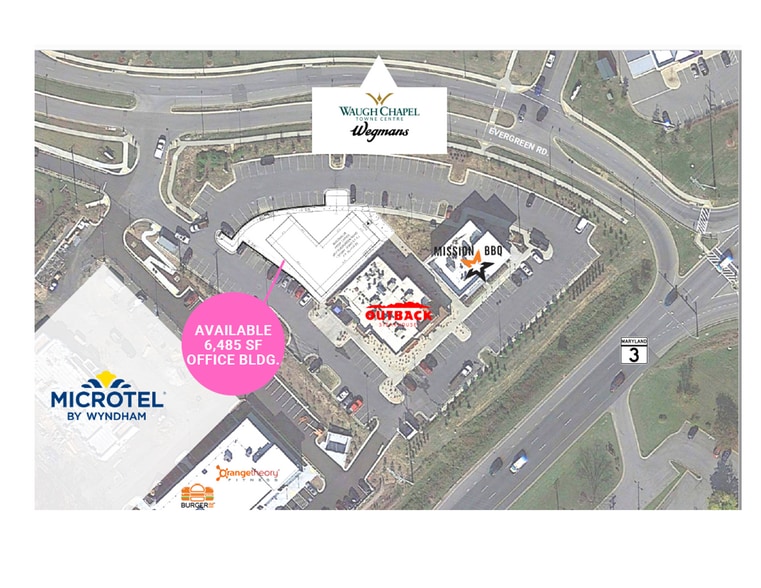Highly visible proposed ±6485 sq ft freestanding retail/ office building Ideal use: Medical / Office / Retail Situated in the heart of Waugh Chapel Town Center anchored by Wegman's, Target, Regal Cinemas, Dicks Sports Next door to a 72 room hotel Outback/ Mission BBQ and 80 unit assisted living facility Over 6 million visitors in 2021 Location at intersection of MD RT 3 with 77,000 cars per day Major growth high income market