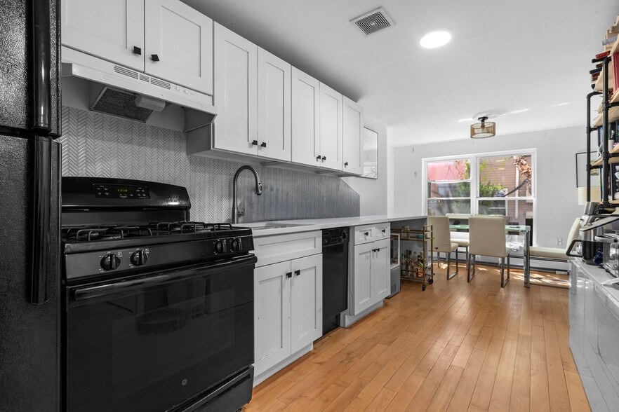 The main 3-story building (3,750 SF above-grade) comprises two well-appointed 1-bedroom floor-through apartments on the upper levels and two flexible convertible 2-bedroom / 1.5-bathroom duplexes on the ground floor. Each unit is updated with hardwood floors, efficient mini-split HVAC, and open kitchens with dishwashers. A common laundry room is conveniently located in the full-height cellar (1,250 SF).