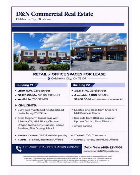 Building #1: 2531 N.W. 23rd Street, Suite #100 Available: 1,000 SF (Building: 3,200 SF) $1,500.00 /Month plus utilities (Water Paid) Building #2: 2519 N.W. 23rd Street, Suite 140 End Cap Available: 780 SF (Building: 10,440 SF) $18.00 PSF/YR Modified Busy, well maintained neighborhood center facing 23rd Street corridor with high visibility. Very well-maintained center with great tenant base.