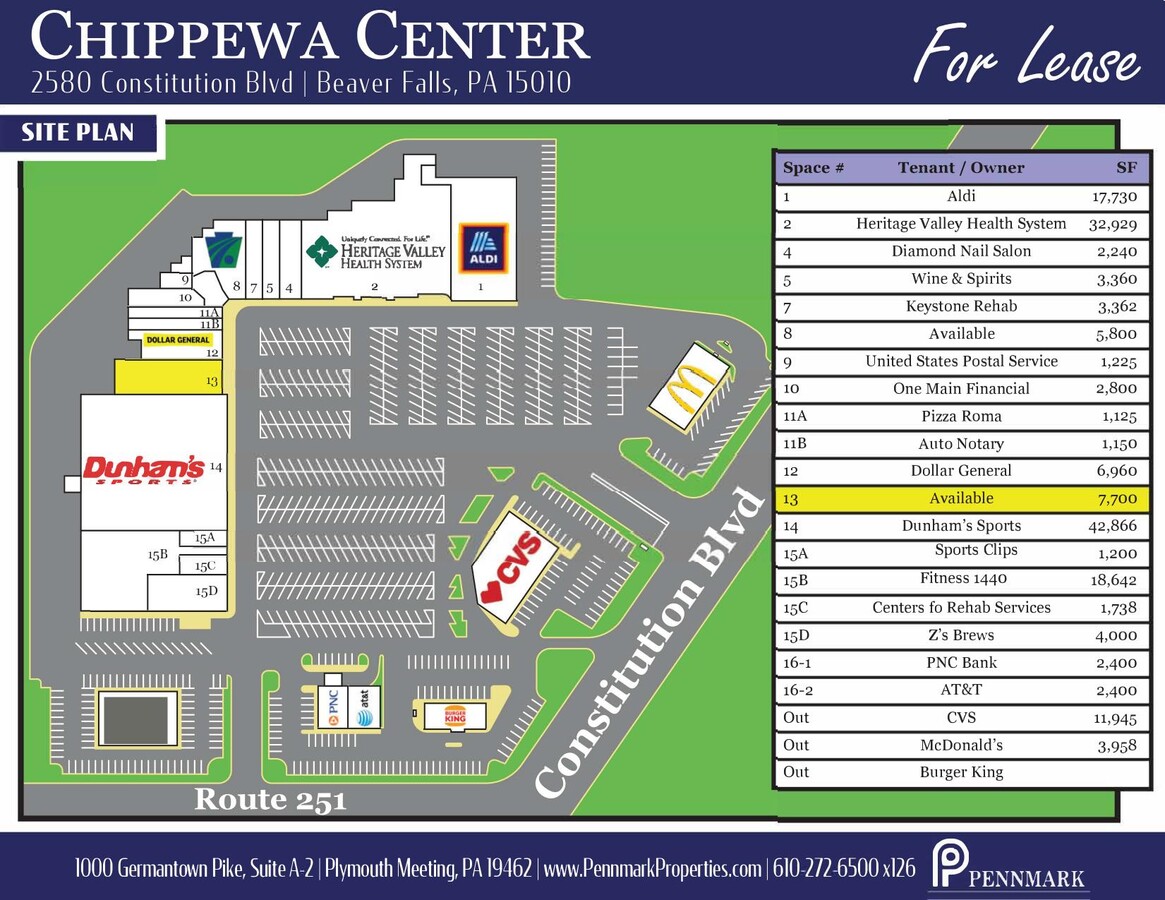 Chippewa Center is a shopping center located along a major regional retail corridor. It is home to a mixture of tenants including; Pizza Roma, United States Postal Service, Subway, PNC Bank, and more. This shopping center is at the corner of Routes 251 and 51, and only minutes from the Beaver Valley Expressway. Prime Location: Situated at 2546-2586 Constitution Blvd, Beaver Falls, PA 15010, Chippewa Center benefits from its strategic position in a growing commercial and retail community. National Tenants: Join an impressive lineup of established national retailers, which draw a steady stream of shoppers to the center. Growing Community: Chippewa Township is experiencing significant development, including a large housing community, further boosting the area's commercial potential. Chippewa Center is not just a shopping center; it's a community hub that attracts a diverse customer base from Beaver Falls and surrounding areas. The presence of national tenants ensures a consistent flow of visitors, providing an excellent opportunity for businesses to thrive. The available 5,800 SF space is perfect for retailers looking to establish or expand their presence in a dynamic and high-performing retail environment. Don't Miss Out! This is a rare chance to secure a spot in one of Beaver Falls' most coveted retail locations. Contact us today to schedule a viewing and become part of the vibrant Chippewa Center community.