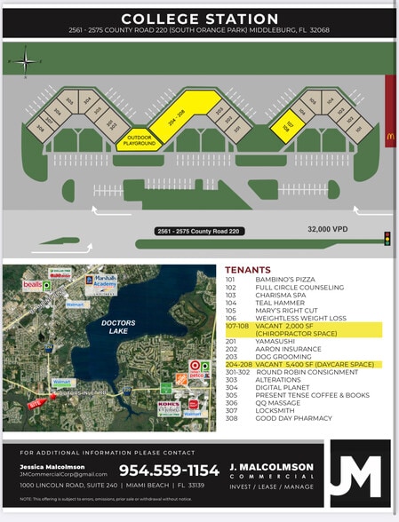 College Station is situated at the lighted intersection of County Road 220 and College Drive. Directly across from Walmart Neighborhood Market and immediately next to Mc Donald's. The center has excellent ingress/egress on CR 220 where over 30,000 cars pass daily. College Station is a neighborhood retail center featuring many local service uses including a Daycare with over 100 students, hair salon, insurance, Sushi and Pizza restaurants, as well as many other service uses.
