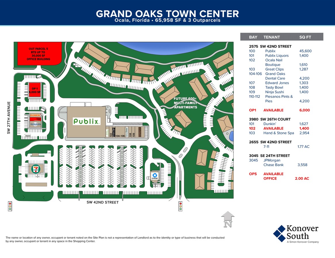 Retail for Lease - Ocala, FL - Last remaining inline space at great looking Publix anchored shopping center located at NEC of SW 42nd Street and SW 27th Avenue. Adjacent to future multi-family development (600+ units) and caddy-cornered to Red Oak Farms, which is approved as a future mixed-use development (2,000+ residences). Join Publix, Chase, Great Clips, Piesanos Stones Fired Pizza, dentist's office and other fast casual restaurants. SW 42nd was recently completed to flyover I-75 and connects to SR 200.