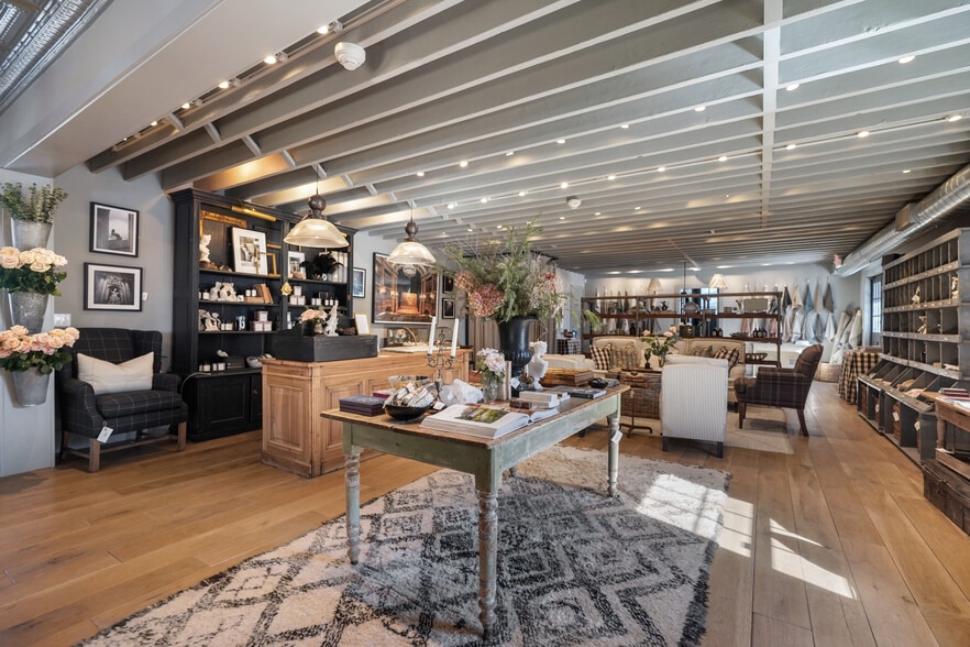 (1) RETAIL SHOWROOM: Expansive showroom and large retail offering with appointed kitchen and bath- this very large open space features wide plank reclaimed hardwood flooring, ample lighting, and an inviting area for work or retail.