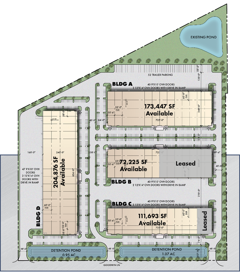 - Move-in ready - 2,730 SF spec office and LED warehouse lighting installed. - Forty (40) loading docks and two (2) 12'x14' ramps - Building depth: 240' - Truck Court: 185' - Trailer Parking: 52 - Clear Height: 32' - Parking Ratio: 1.33/1,000 SF - ESFR Fire Suppression - 480v, 3-phase power, 2,000amps available
