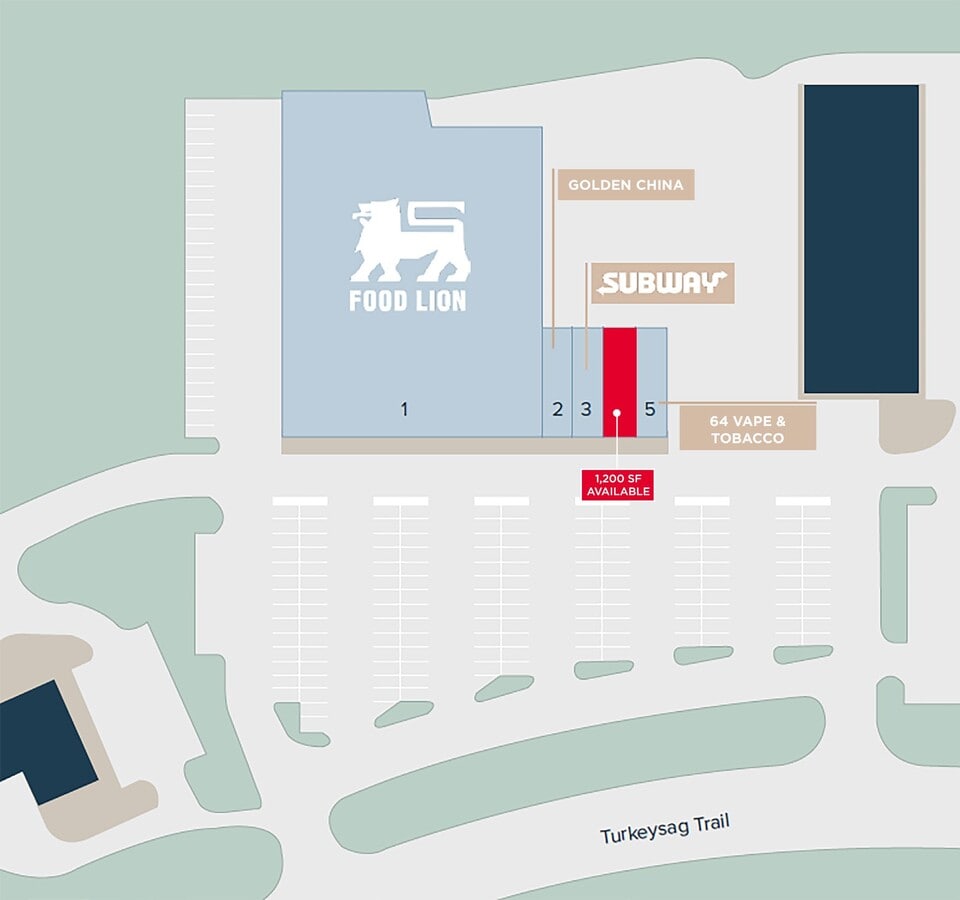 264 Turkeysag Trail offers a 1,200-square-foot retail space for lease within a Food Lion-anchored shopping center in Palmyra, Virginia. This location provides strong visibility and consistent customer traffic, benefiting from its position along Thomas Jefferson Parkway just outside Charlottesville. The center is anchored by a major grocery tenant and surrounded by a mix of national and regional retailers, creating a strong draw for daily needs and convenience shopping. The available space is ideal for a variety of retail uses and is supported by a robust trade area with a 5-mile population of over 16,000 and an average household income exceeding $115,000 within one mile. Nearby retailers include Subway, Verizon, Papa John’s, Dunkin’ Donuts, Goodwill, Atlantic Union Bank, and UVA Community Credit Union, ensuring a complementary tenant mix. With its grocery-anchored positioning, convenient access, and proximity to established neighborhoods such as Lake Monticello and The Village at Nahor, this property offers an excellent opportunity for retailers seeking a well-located space in a growing market.