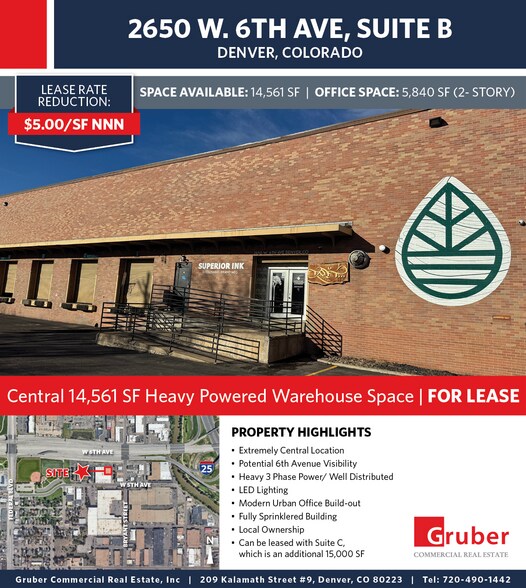 Central 14,561/SF Warehouse unit for lease with 4 docks, 21ft clear, heavy power and local ownership! Only $5.00NNN. Very hip and urban office build out. Well distributed HEAVY power and frontage on 6th Avenue at I-25! Additionally there is a 15,000/SF 2 dock unit coming available that will be just storage with restrooms. Landlord will get very aggressive on the storage unit lease rate!