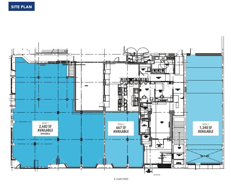 Up to 3,349 SF available Retail 1: 2,682 SF (divisible) – black iron available Retail 2: 667 SF Corner location just 1 block south of the highly trafficked Clark / Broadway / Diversey intersection Heavy pedestrian traffic along Clark Street Less than ½ mile from the CTA Diversey ‘L’ Station and the North Pond Nature Sanctuary in Lincoln Park Nearby retailers include Target, Trader Joe’s, Nando’s Peri Peri, Starbucks, T.J. Maxx, Barnes & Noble, Stan’s Donuts, and more