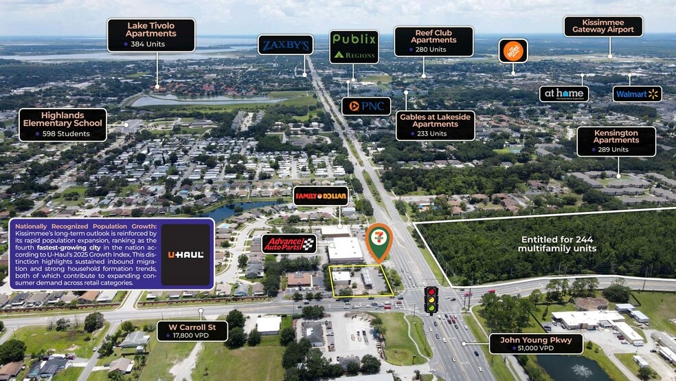 - Major Growing Population: With a 5-mile population of 240,000, Kissimmee was recognized by U-Haul as the 4th fastest growing city in the USA.