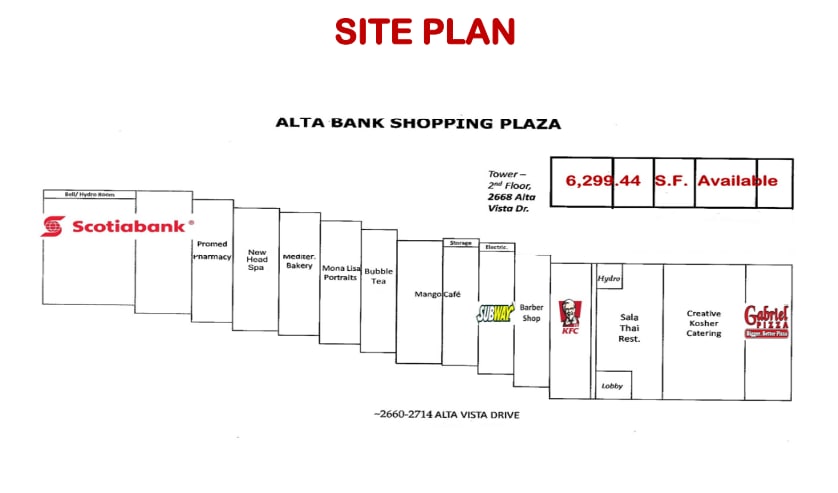 Alta Bank Plaza is an established community shopping center located at the corner of Alta Vista Drive and Bank Street. This busy neighbourhood center services Alta Vista, South Keys, Walkley Road, Riverside Drive, Pleasant Park, Bank Street. High traffic location. Surrounded by residential neighborhoods and amenities like Service Ontario, which creates a steady flow of traffic and attracts a wide variety of people to the plaza. Join KFC, Scotiabank, Subway, and Gabriel Pizza as a neighbouring tenant. Independent grocery, Chez Cora, Pet Valu, and Dollarama across the street.