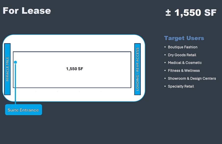 Position your brand in the heart of Coral Gables with this exceptional ±1,550 SF ground-floor retail suite on Miracle Mile. This turnkey space offers unmatched visibility and premier frontage along one of South Florida’s most iconic retail corridors. Surrounded by a vibrant mix of luxury boutiques, fine dining, entertainment venues, and lifestyle amenities, the location ensures a steady stream of foot traffic from both locals and tourists. The property benefits from abundant metered street parking and multiple public garages within walking distance, making access convenient for customers and deliveries. Strong co-tenancy and proximity to over 600 hotel keys, 2,000+ residential units, and 6.6M SF of office space amplify its appeal for retailers seeking a dynamic, high-density environment. Ideal for boutique fashion, wellness operators, medical and cosmetic practices, and specialty retail concepts, this space offers a rare opportunity to establish a presence in Coral Gables’ most coveted retail destination.