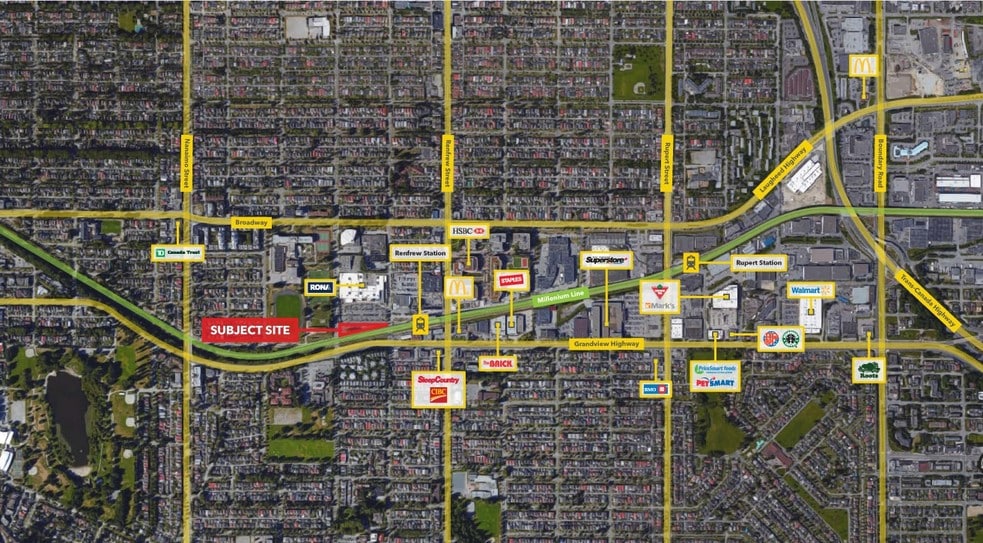 - Surface parking with approximately 328 stalls and street parking along Slocan - Street, E 12th Avenue, and Kaslo Street - Area retailers include Real Canadian Superstore, Wal-Mart, Canadian Tire, and Staples - Steps away from Renfrew Skytrain Station - Average household income in the area is approximately $73,000 - Pad opportunity from 2,000 - 5,000 SF - Located just off South Grandview Highway between Slocan and Kaslo Street