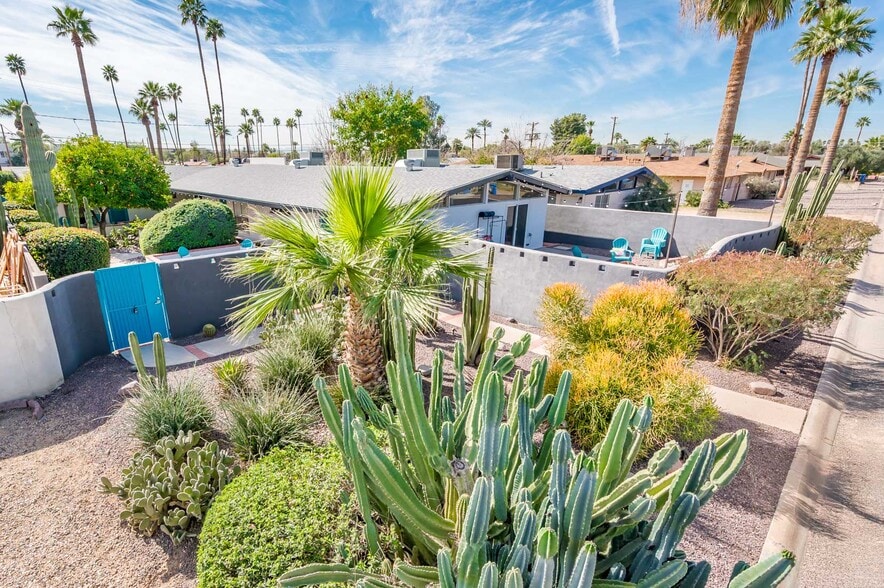 Rare turn-key mid-century modern triplex in the heart of the Biltmore corridor within a lush desert landscape setting. Gated, walled courtyard creates sanctuary for this compound featuring two 2-bed/2-bath units and one spacious 1-bed/1-bath unit with delightful wood flooring. Unit 1 features a private large patio Enclosed 3-car garage with assigned spaces and private storage, plus shared on-site laundry. Owner pays water/sewer; tenants pay electric. Recent capital improvements and transferable termite warranty. Proximity to Sprouts, Starbucks, dining and breweries. Boutique multifamily asset in one of Phoenix's strongest rental corridors with long-term appreciation appeal.