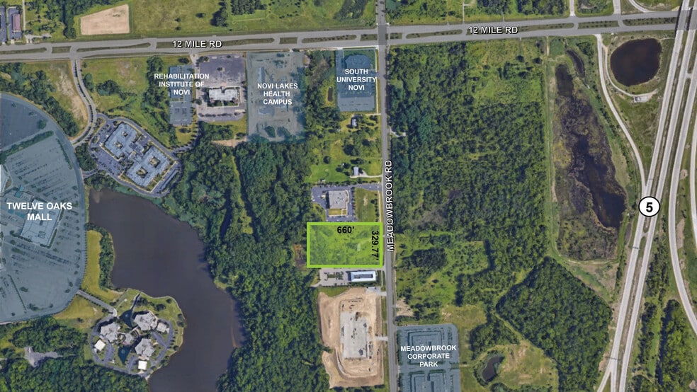 Introducing a prime 5-acre development opportunity at 27421 Meadowbrook, Novi, MI. With the flexibility afforded by the OST zoning, this property is ideal for a wide range of opportunities, including medical and professional offices, healthcare facilities, banks or financial institutions, daycare or adult daycares, hotels, restaurants, and recreational facilities. The property has 329' of frontage on Meadowbrook Rd, a depth of 660,' and is adjacent to Twelve Oaks Mall & Meadowbrook Corporate Park. Excellent location on Meadowbrook Rd in between 12 Mile Rd and I-96. The property is within proximity to Twelve Oaks Mall, South University Novi, The Rehabilitation Institute of Michigan - Novi Center, and the new Novi Lakes Health Campus, Assisted Living Facility.