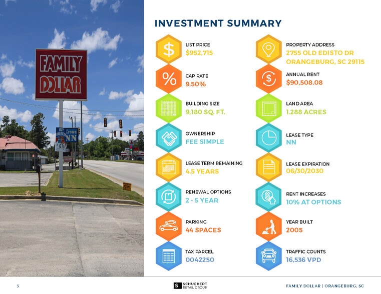 Family Dollar 2755 Old Edisto Dr 9,180 SF Retail Building Orangeburg, SC 29115 $1,324,264 CAD ($144.26 CAD/SF) 9.50% Cap Rate