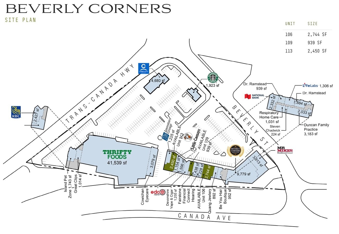 Beverly Corners is a premier retail destination in Duncan, BC, offering high-visibility commercial opportunities in one of the region’s most active shopping centers. Anchored by top-performing tenants including Thrifty Foods, Starbucks, Mr. Mikes Steakhouse, and Beverly Corners Liquor Store, this center benefits from consistent foot traffic and over 30,000 vehicles per day along Beverly Street. Strategically located across from the newly built Cowichan Secondary School and Vancouver Island University, the site draws a steady stream of students, faculty, and local residents. The surrounding area is undergoing rapid transformation, with new residential developments and the construction of the Cowichan District Hospital contributing to a growing and dynamic consumer base. The center’s C2 zoning allows for a wide range of commercial uses, making it ideal for retailers, service providers, and food and beverage operators. With 421 on-site surface parking stalls and immediate availability, Beverly Corners offers a compelling opportunity for businesses seeking long-term success in the Cowichan Valley. The site plan reveals a well-integrated mix of national and local tenants, including LifeLabs, National Bank, Coast Capital Savings, and Little Caesars. The plaza’s layout supports strong visibility and accessibility, with multiple entry points and proximity to major thoroughfares including the Trans-Canada Highway.