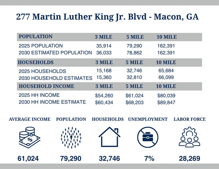 - Approximately 2.5 miles from the Interstate 16/ Interstate 75 interchange (Exit 2), providing quick regional access