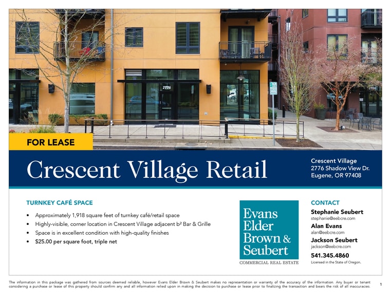 TURNKEY CAFÉ SPACE • Approximately 1,918 square feet of turnkey café/retail space • Highly-visible, corner location in Crescent Village • Space includes large dining area, counter, walk-in cooler, grease trap, Type II hood & floor drain • Crescent Village tenants include Bello Day Spa, Pho The Good Times, Izumi, b² Bar & Grille, Pawsitive Veterinary Care & North Fork Tavern • Space is in excellent condition with high-quality finishes • $25.00 per square foot, triple net