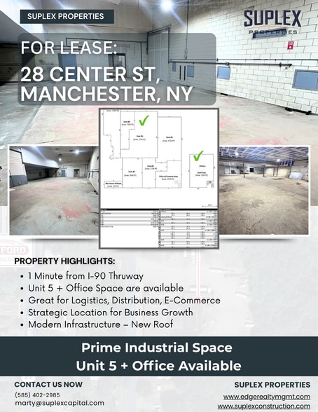 Seize this rare opportunity to lease a versatile commercial/flex property in the heart of Manchester. Strategically located near I-90, the building offers excellent visibility, easy regional access, and a highly adaptable layout. Currently Available: - Unit 5: Dock-height doors, shared restrooms, flexible space for warehouse, light industrial, or distribution - 2nd-Floor Office: Ideal for office, administrative, or professional use Features include 15-ft ceilings, ample parking with over 200 spaces, and a layout designed for operational flexibility. Highlights: - Prime Manchester location near I-90 - Available Units: 5 & 2nd-floor office - Flexible layout for office, warehouse, light industrial, or distribution - 15-ft ceilings for operational efficiency - Over 200 parking spaces