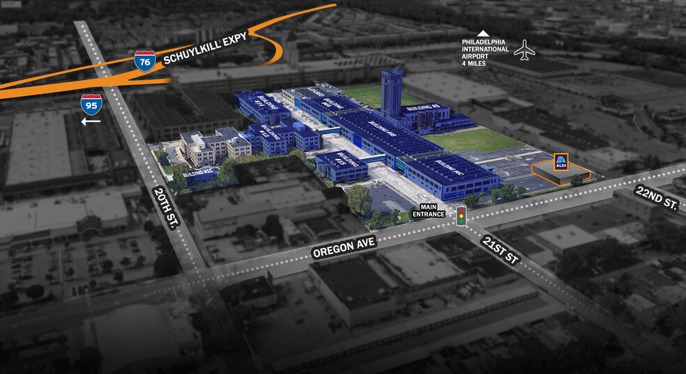 The Quartermaster @ 21st & Oregon offers a rare opportunity to lease space within one of Philadelphia’s most ambitious adaptive reuse developments. Formerly a military logistics center, this 24-acre campus has been transformed into a vibrant Science + Technology Park, blending historic architecture with modern infrastructure. The site features six Art Deco buildings anchored by a central clocktower, and is listed on the National Register of Historic Places. Tenants benefit from a wide range of space types including retail, creative experiential, bio/lab offices, and fitness uses. Ceiling heights range dramatically from 12 to 75 feet, with extensive skylighting and flexible layouts. The campus offers unmatched scale, including up to 330,000 SF under one roof and 180,000 SF on a single floor, making it ideal for large-format users. Strategically located in South Philadelphia, the property provides direct access to major highways, Center City, University City, and the Philadelphia International Airport. It’s also minutes from the city’s sports stadiums and bridges to New Jersey and Delaware. Ample parking and outdoor amenities—including a 2.5-acre lawn for events and pop-ups—enhance the tenant experience. The Quartermaster is actively seeking restaurants, breweries, retail operators, interactive experience creators, and fitness concepts to join its growing community.