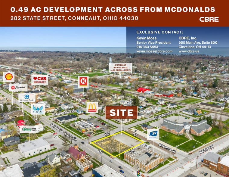 The property at 282 State Street in Conneaut, Ohio, is a 0.49-acre vacant land site zoned for general business use. It is situated in a commercial district across from McDonald’s and adjacent to the U.S. Post Office. The site fronts State Street near the intersection of Madison Street and Broad Street, with a reported traffic flow of approximately 5,117 average daily vehicles. Surrounding properties include a mix of retail establishments and service businesses such as CVS Pharmacy, Dollar General, Circle K, and O’Reilly Auto Parts. The location offers proximity to local amenities and Conneaut Harbor, which attracts an estimated 425,000 visitors annually.