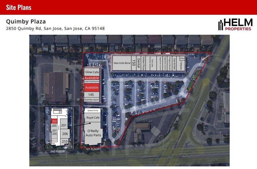 Located at the busy intersection of Quimby and S. White Road in San Jose, with a dense population of over 30,000 people within a 1-mile radius. The center provides high visibility with a great opportunity with high traffic. A good blend of convenience stores, grocers, restaurants, schools, & a mix of retail. Most retail is a first-floor storefront with the ability to take advantage of lower rents on the 2nd floor. Spaces range from 200 sf. Ask an agent about showing times.