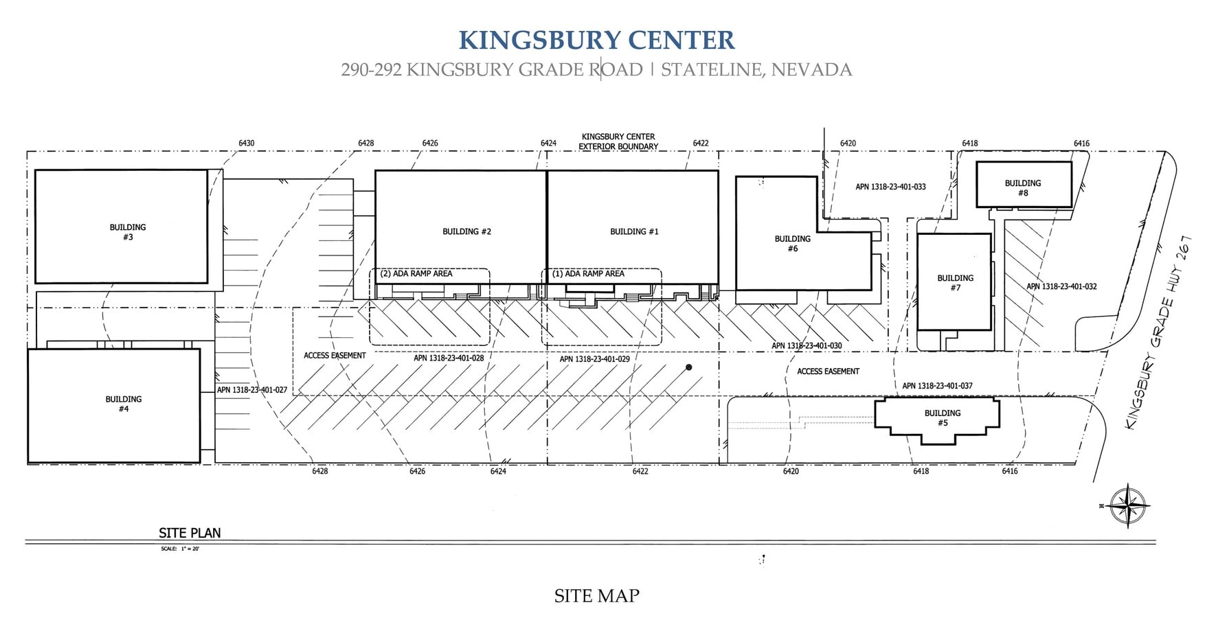 Over the past 50 years, The Kingsbury Center has become one of Lake Tahoe’s landmarks, and home to many well-known establishments. With direct frontage and access along lower Kingsbury Grade Road, this nine-building/29-unit commercial center is conveniently located in the heart of Kingsbury’s well-established residential and ski resort communities to the east and the Stateline casino entertainment strip and the sparkling blue lake to the west. Commonly known as Kingsbury Grade (State Route 207), this major arterial roadway averages 12,000 to 15,000 vehicles per day. Kingsbury Center benefits from its prime frontage and exposure being less than a half-mile east of the U.S. HWY 50/State Route 207 intersection and less than 2.5 miles from the gaming casinos in Stateline. Built, owned, and locally managed by The Hall Trust, the Kingsbury Center leases to an array of tenants, from restaurants to salons, from boutique stores to home-services, from medical to business solutions. Enjoy the synergy of neighboring tenants, including Audible’s Bar & Grill, E&V Italiano restaurant, Clyde’s Coffee, Will & Ivey, Cash USA, and Arctic Electricians…just to name a few. At the Kingsbury Center, the landlord provides water and sewer, snow removal, building maintenance, property taxes and insurance. Tenants are responsible for electricity, communication/data, refuse, and personal liability insurance. No CAMs! (These statements are not to serve as exhaustive itemizations of landlord/tenant responsibilities.) Historically, this 32,000+ square foot center maintains a low vacancy rate with some tenants having maintained their lease for nearly 40 years…so, now is the time to claim your space!