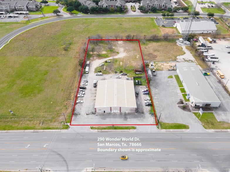 290 Wonder World Drive presents a highly visible industrial flex building offering exceptional frontage along one of San Marcos’ primary commercial corridors. The property consists of a ±9,800-square-foot warehouse situated on a generous ±1.88-acre parcel, providing a rare combination of immediate usability and excess land in a rapidly growing submarket. The building features a steel construction with clear-span warehouse space suitable for a wide range of industrial, service, automotive, and flex uses. With G-C Legacy zoning, the property allows for a broad array of commercial applications, and the site layout supports single-tenant occupancy or potential demising for multiple users, subject to tenant requirements and approvals. Surface parking is available on site, with room for 30+ vehicles. The rear section of the property is available as an additional leasable area and may be utilized for parking, storage, or other approved ancillary uses. Strategically positioned along Wonder World Drive with traffic counts exceeding 33,000 vehicles per day, the property benefits from strong visibility and convenient access to I-35, placing it squarely within the Austin–San Antonio prime growth corridor. The site is surrounded by major retailers, financial institutions, medical services, and dense residential development, and is located just minutes from Texas State University and the San Marcos Premium Outlets. Please contact agent for more details.