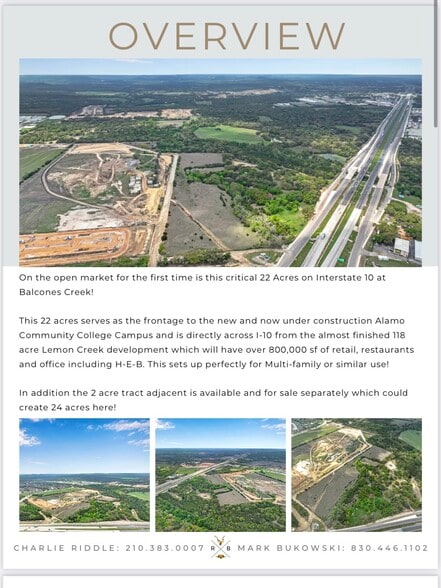 22 acres ready for development with utilities close, brand new H-E-B and full Lemon Creek retail/mixed use center directly across I-10. Flat and primarily cleared acreage. Priced for PFE Multi-family, Medical, Dealership, Corporate enduser or Mixed Use. Call Charlie for details 210.383.0007
