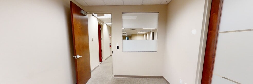 Open floor plan with private offices and floor to ceiling windows.