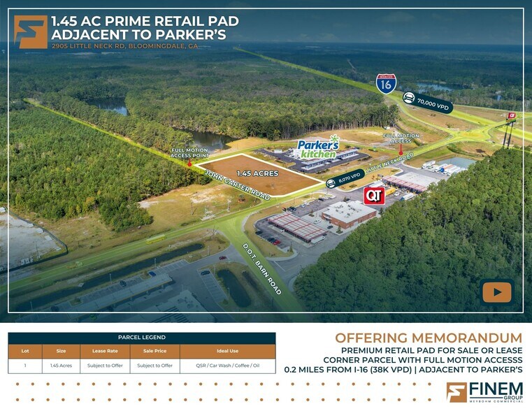 The Finem Group at Meybohm Commercial is pleased to exclusively present 2905 Little Neck Road in Bloomingdale, GA for sale or ground lease. This ±1.46-acre pad-ready commercial parcel is strategically located just 0.2 miles from I-16 at Exit 156 and offers exceptional access and visibility in one of Chatham County’s fastest-growing residential corridors.