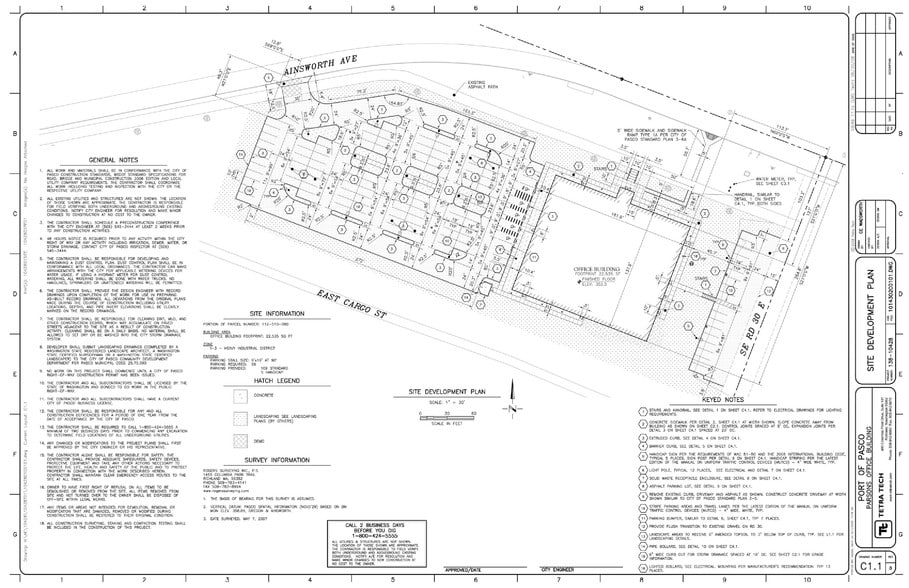 Newer office and design space for large company with plenty of parking. Inside there's a formal reception area, 64 modular work stations in-place, 4 conference rooms, a large lunchroom, and 11 private offices located around perimeter of floor plan. Open central area provides great circulation. Located in the Port of Pasco's Big Pasco Industrial Center on major transportation routes. Conveniently across the street from industrial manufacturing space and planned as part of an industrial manufacturing campus. Less than 20 minutes drive from anywhere in the Tri-Cities. Only 10 minutes from the Tri-Cities Airport (PSC).