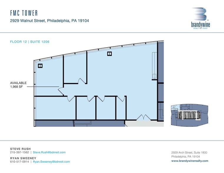 | 12th Floor, Ste 1206 | 1,968 SF | Negotiable | Upon Request Upon Request Upon Request Upon Request | Office | Partial Build-Out | Now |