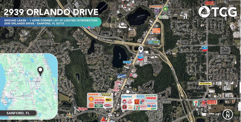 The property consists of a 1.01-acre parcel located at the intersection of Orlando Drive (US-17) and East Airport Boulevard in Sanford, Florida. It is positioned near the interchange with S. Florida 417 and is in proximity to Orlando Sanford International Airport. The surrounding area includes multiple national retailers, restaurants, and service businesses. Traffic counts on nearby roadways exceed 50,000 vehicles per day.