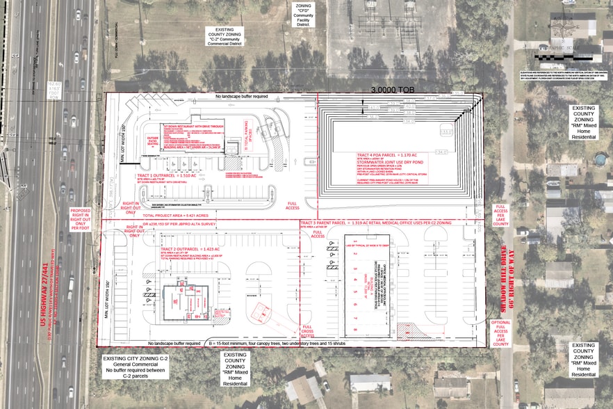 Situated on US-441/US-27 with a high average traffic count of 30,000 CPD. Across from the new 7-Eleven and the future Enclave at Lake Geneva residential development, which will feature over 420 dwelling units. Less than a 15-minute drive from The Villages, recognized as America’s top master-planned community for retirees. Surrounded by a variety of professional services and single-family residential homes, with the Fruitland Park City Hall and Recreation/Community Center in close proximity. • Parcel C – ±1.319 Acres – Spaces Available (contact for more info) • 11,200± SF Retail and Medical Office • 1,400± SF spaces (20’ wide x 70’ deep)
