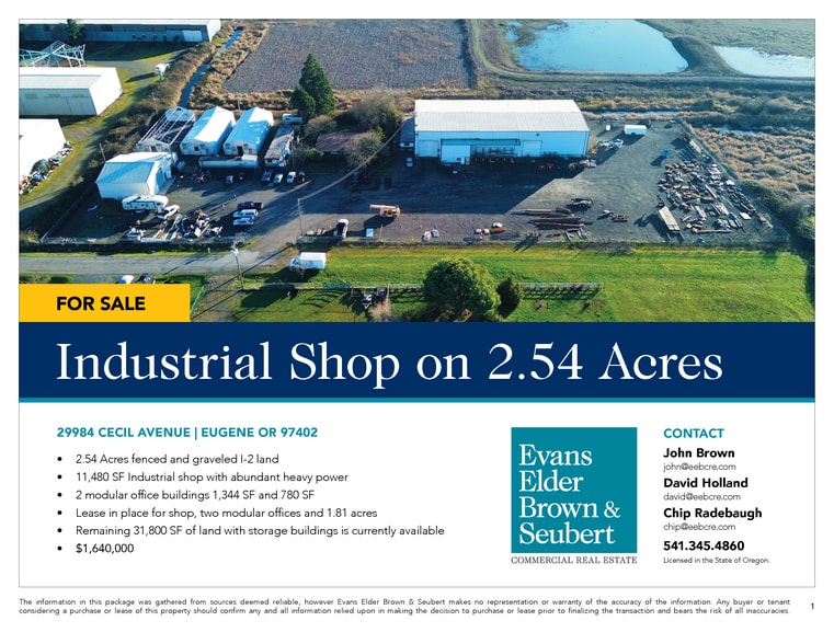 29984 Cecil Ave 12,824 SF 100% Leased Industrial Building Eugene, OR 97402 $2,260,740 CAD ($176.29 CAD/SF) 7.16% Cap Rate