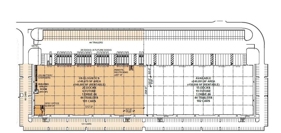 • ± 149,685 SF Total • ± 3,343 SF of Office • ESFR • 36’ Clear • 26 - 9’ x 10’ Dock Doors (Expandable to 32) • Dock Packages - 45,000 lb. Pit Levelers, Brush Weather Seals, Night Locks, Bumpers and Dock Lights • 1 - 12’ x 14’ Grade Level Loading Door • Column Spacing - 52’ x 50’ (60’ in Speed Bay) • Zoned - M-2 Industrial • LED Motion Sensor Lights; 30 FC • 7” Non-Reinforced Concrete Slab, 4,000 psi • 3-Phase, 480 V, 2,000 Amp • 185’ Truck Court • + 44 Trailer Stalls • + 181 Car Parking Spaces • Construction - Tilt-Concrete Panels • Dimensions - + 572' x + 264' • Lease Expiration - 12/31/30