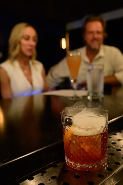 Speakeasy-inspired bar featuring black and dark blue velvet décor, a long, black-topped bar, and a curated craft cocktail program.