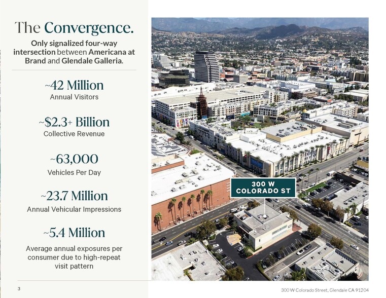 Located at 300 W. Colorado Street, this flagship retail property is situated at the "Crossroads of Glendale's Retail Epicenter," serving as the only signalized four-way intersection between the Americana at Brand and the Glendale Galleria. This premier location benefits from approximately 42 million annual visitors and a collective revenue of over $2.3 billion from its neighboring retail icons. The property offers exceptional brand visibility with a two-story glass façade, multi-directional exposure, and dominant double-billboard illuminated signage visible from all frontages. Additionally, it features a custom monument sign at the intersection to further anchor its presence in this high-traffic corridor, which sees roughly 63,000 vehicles per day. The building encompasses a total area of 12,700 square feet on a 0.74-acre site, consisting of a 7,758-square-foot ground floor and a 4,942-square-foot mezzanine. The ground level is designed as a double-height flagship space with ceiling heights reaching up to 21'4", while the second floor provides a flexible configuration for various upper-floor needs. Practical amenities include 45 exclusive on-site parking spaces, providing a ratio of approximately 3.5 per 1,000 square feet, accessible from all surrounding streets. Occupancy costs are positioned competitively at $7.95 PSF/Mo. plus NNN, with triple net costs significantly lower than those of the adjacent Americana and Glendale Galleria