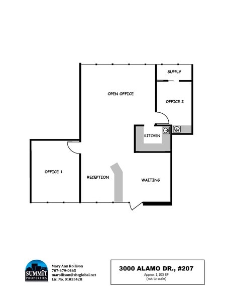 Contemporary. Flexible. Connected. Move your business to a space that works as hard as you do! 3000 Alamo Dr., Suite 200 is a premier Vacaville location for professional and medical users alike. This sunlit suite features windows in every room and a unique architectural outdoor atrium at the heart of the complex. Features: Large, open-concept reception area and generous lobby, private office, plus a sizable flex office (easily partitioned). Flexibility: Highly adaptable floor plan for converting to 1–3 private offices. Location: High-traffic retail, dining, and easy access to public transportation. Amenities: Timeless architecture with ample on-site parking.