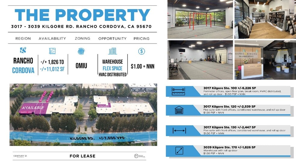 3017 – 3039 Kilgore Rd. in Rancho Cordova, CA are two flex buildings that are situated East of Zinfandel Dr. and West of Sunrise Blvd. with White Rock Rd. immediately South and HWY 50 due North. Each building consists of +/-27,239 SF, totaling +/-54,478 SF. 3017 Kilgore Rd. has +/-11,012 SF available of FLEX SPACE and 3039 Kilgore Rd. +/-9,358 SF available. Predominate features of these Flex buildings include multiple roll-up doors with open and a flexible layout for a multitude of users. Tenant’s will have the benefit of utilizing the flexible layout to their advantage to best suit their business needs. Additionally, tenants can benefit from the large parking field and multiple ingress and egress points for large vehicles, not far from Sunrise Blvd. & HWY 50. The buildings offer a grand centralized entrance surrounded by a well-maintained landscape with a clean parking lot that offers ample parking both in the front and rear of the buildings. A competitive lease rate, motivated ownership, a flexible layout, and well-maintained landscape and buildings make this a desirable location for tenancy.