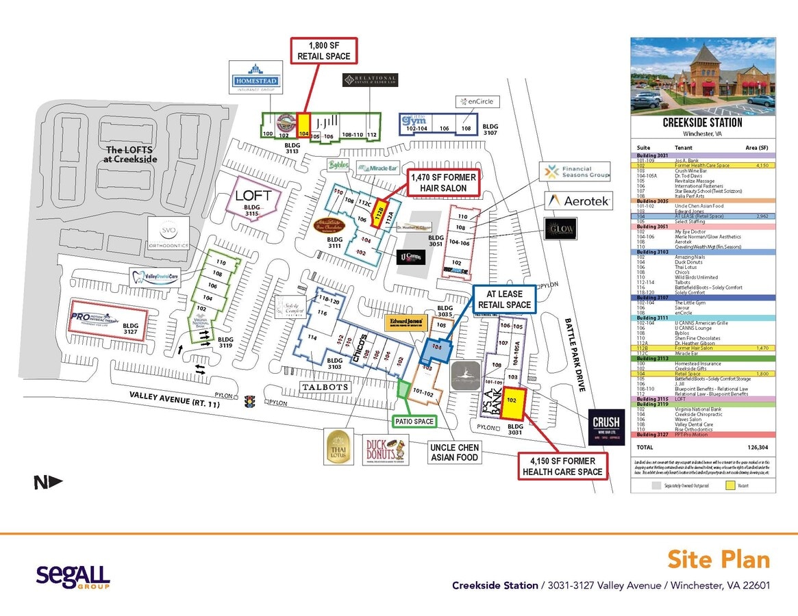 Creekside Station is a beautifully-designed boutique retail, restaurant and service development located on Valley Avenue in south Winchester, VA. The project includes national apparel (Talbots, LOFT, Jos A Bank & Chicos), service, medical, financial, legal and a variety of restaurant uses in a well landscaped, walkable environment. Two adjacent office projects, Creekside Village and Opequon Center, provide additional daytime population and customer draw. New ownership seeks complimentary uses to upgrade the existing upscale merchandise mix.