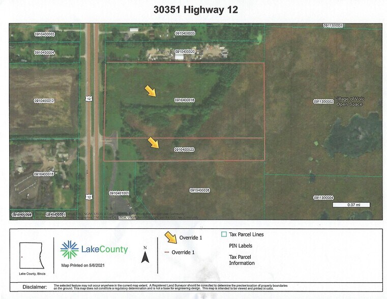 ROUTE 12 LOCATION, 1,841 feet frontage. APPROXIMATELY 22 ACRES. Currently unincorporated Lake County Pin 09-10- 400-016 Zoned AG/OS Frontage 1,129.53 frontage. Contiguous to the Village of Volo pin 09-10-400-023 Zoned LI Frontage 711.50 feet. Commerc